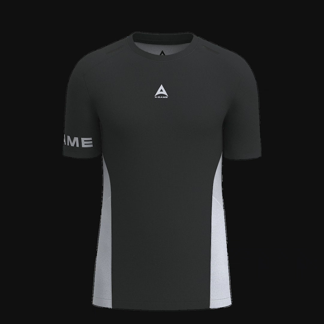 MENS A-GAME PERFORMANCE TRAINING TSHIRT in black and white. Woven from 100% recycled lightweight polyester with antibacterial and sweat-wicking properties.
