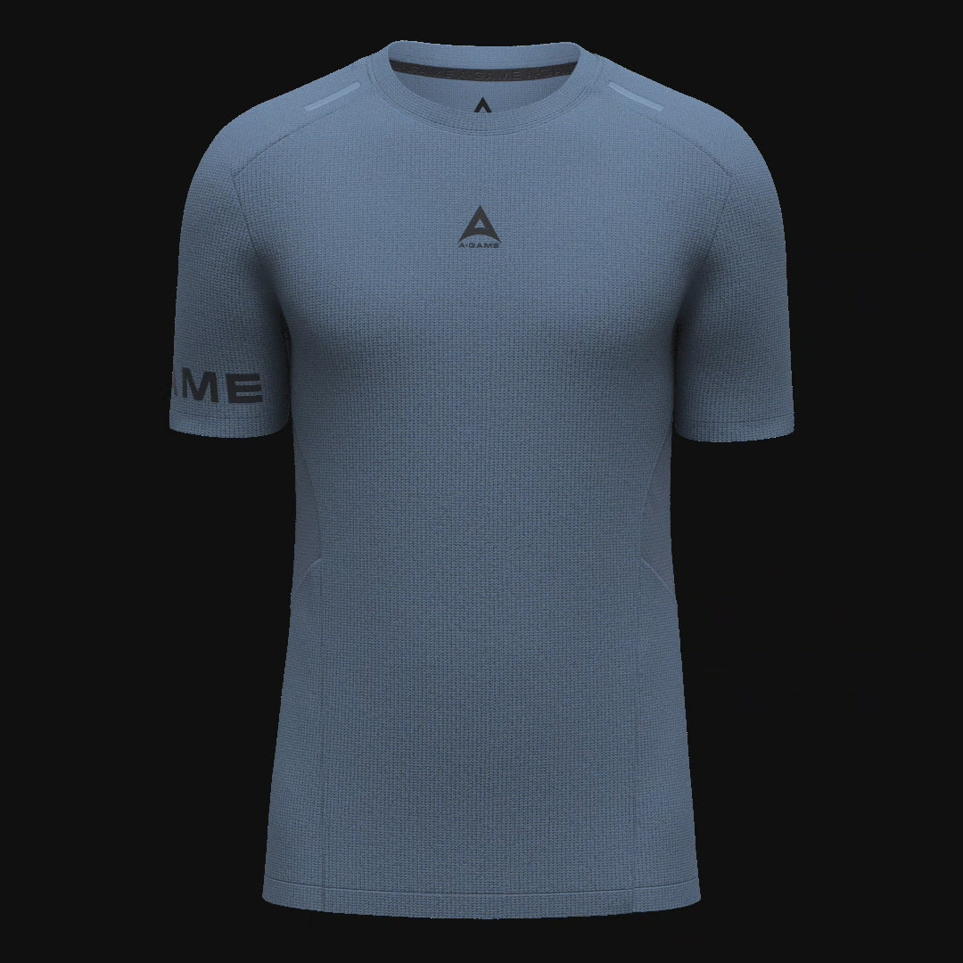 MENS A-GAME PERFORMANCE TRAINING TSHIRT in ocean blue. Woven from 100% recycled lightweight polyester with antibacterial and sweat-wicking properties.